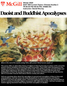 This course offers an alternative history of religion in China by focusing on visions of the end of the world in Chinese Buddhist and Daoist thought and practice. These ideas often developed on the margins of society or in direct opposition to the state. How did these groups conceive of time and space? What experiences did members of these movements have? What did they gain from participation in them? By moving these groups to the centre of Chinese history, we may then be able to reconsider how we think about Chinese society and culture.